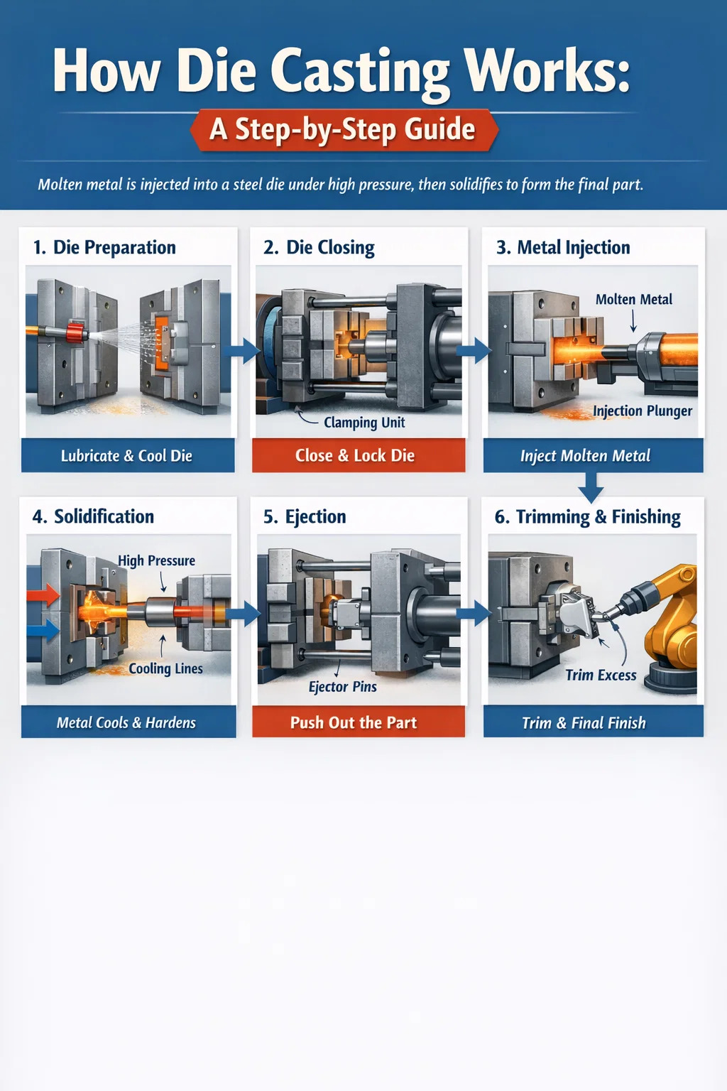 Odlewanie ciśnieniowe to proces formowania metalu, podczas którego stopiony metal jest wtryskiwany pod wysokim ciśnieniem do hartowanej stalowej formy — zwanej matrycą — i trzymany tam do czasu, aż metal zestali się i uzyska dokładny kształt wnęki. Po zestaleniu matryca otwiera się, kołki wypychające wypychają część i cykl rozpoczyna się od nowa. Pojedyncza kostka może powtórzyć tę sekwencję setki tysięcy razy, zanim się zużyje.
