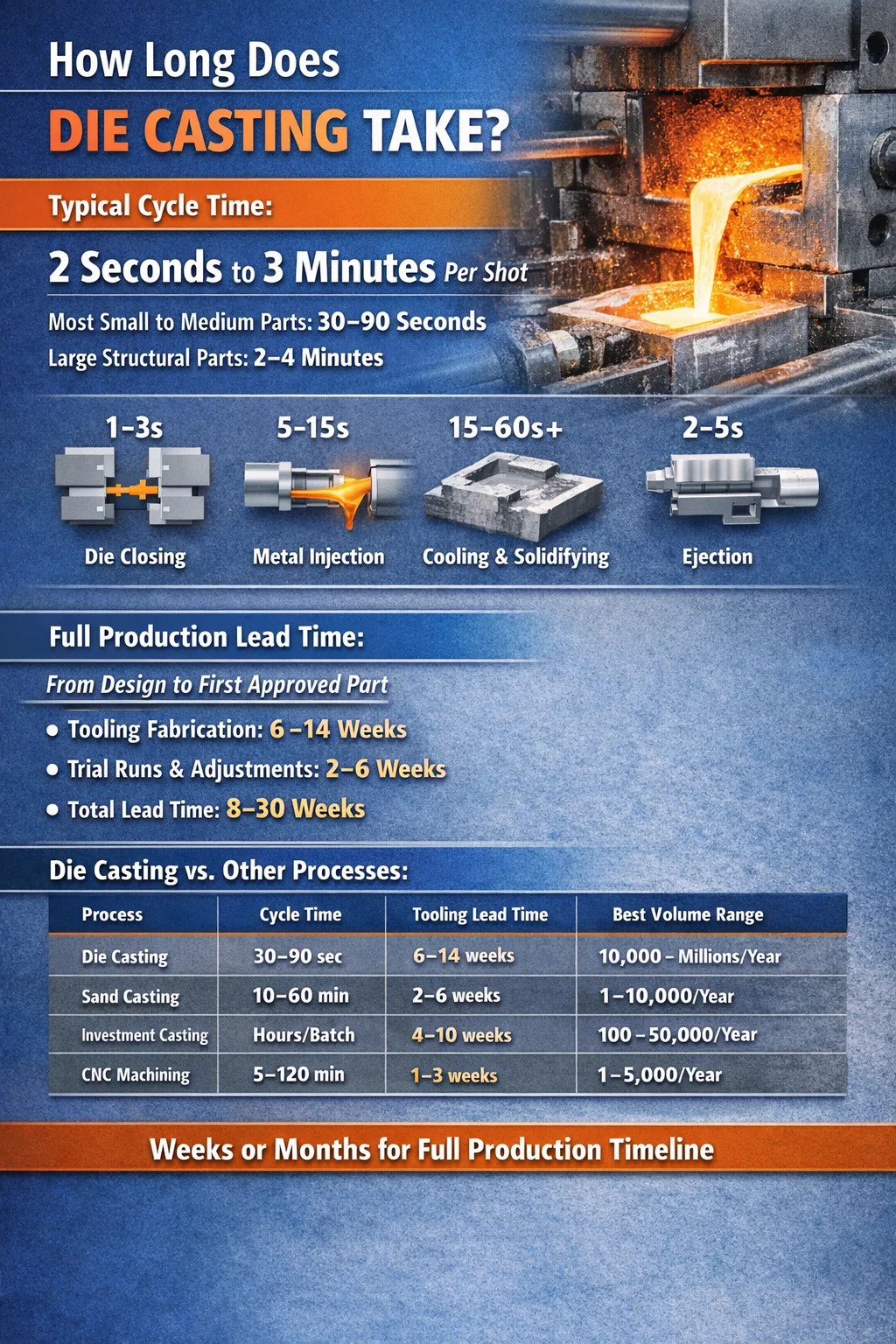 Liczba czasu cyklu opowiada tylko część historii. Zanim pierwsza dobra część zjedzie z linii, operacja odlewania ciśnieniowego obejmuje wykonanie oprzyrządowania (co może zająć 6–14 tygodni), ustawienie maszyny, wstępne podgrzewanie matrycy, strzały próbne i weryfikację wymiarów. Od surowego projektu do zatwierdzonej części produkcyjnej, pełny harmonogram mierzony jest w tygodniach lub miesiącach, a nie sekundach.