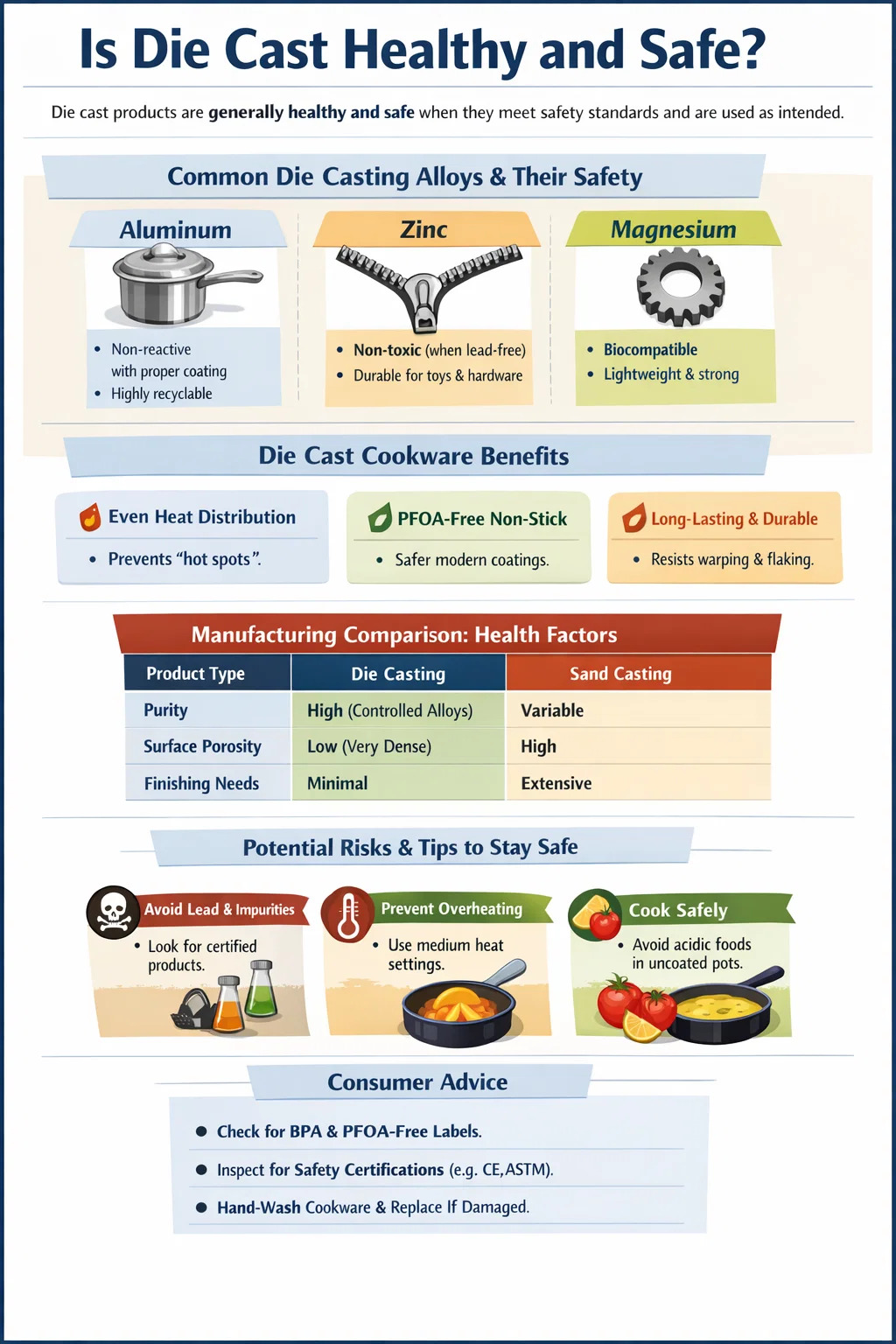 Ogólnie rzecz biorąc, produkty wykonane przez odlewanie ciśnieniowe są uważane za zdrowe i bezpieczne w codziennym użytkowaniu, pod warunkiem, że spełniają międzynarodowe standardy bezpieczeństwa i są używane zgodnie z przeznaczeniem. „Zdrowie” odlewu ciśnieniowego zależy przede wszystkim od użytego metalu nieszlachetnego (takiego jak aluminium, cynk lub magnez) i zastosowanej obróbki powierzchni. W kontekście naczyń kuchennych odlew aluminiowy jest bardzo popularny, ponieważ nie reaguje z odpowiednią powłoką, natomiast w przypadku zabawek i sprzętu cynk jest preferowany ze względu na jego trwałość i brak toksycznych dodatków, takich jak ołów.