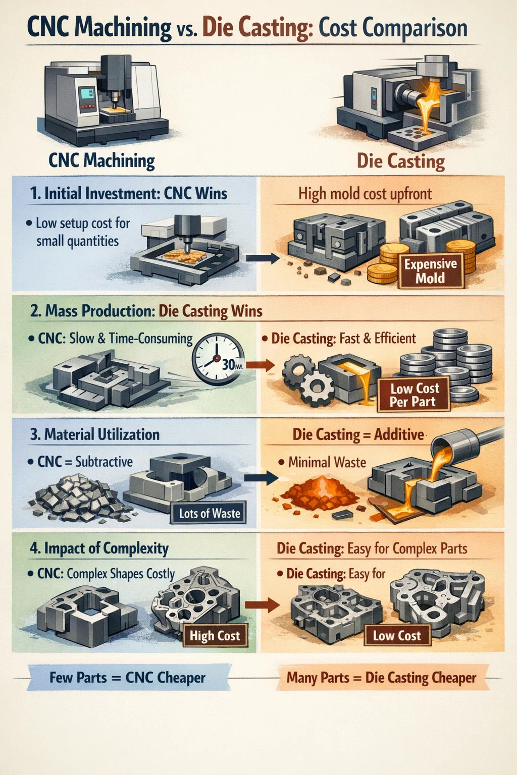 Szybkość decyduje o koszcie: odlewanie ciśnieniowe może „wyprodukować” część w ciągu kilku sekund, podczas gdy CNC może zająć pół godziny skrupulatnej pracy. Czas to pieniądz, a przy produkcji na dużą skalę wydajność odlewania ciśnieniowego może obniżyć koszt jednostkowy do bardzo niskiego poziomu.