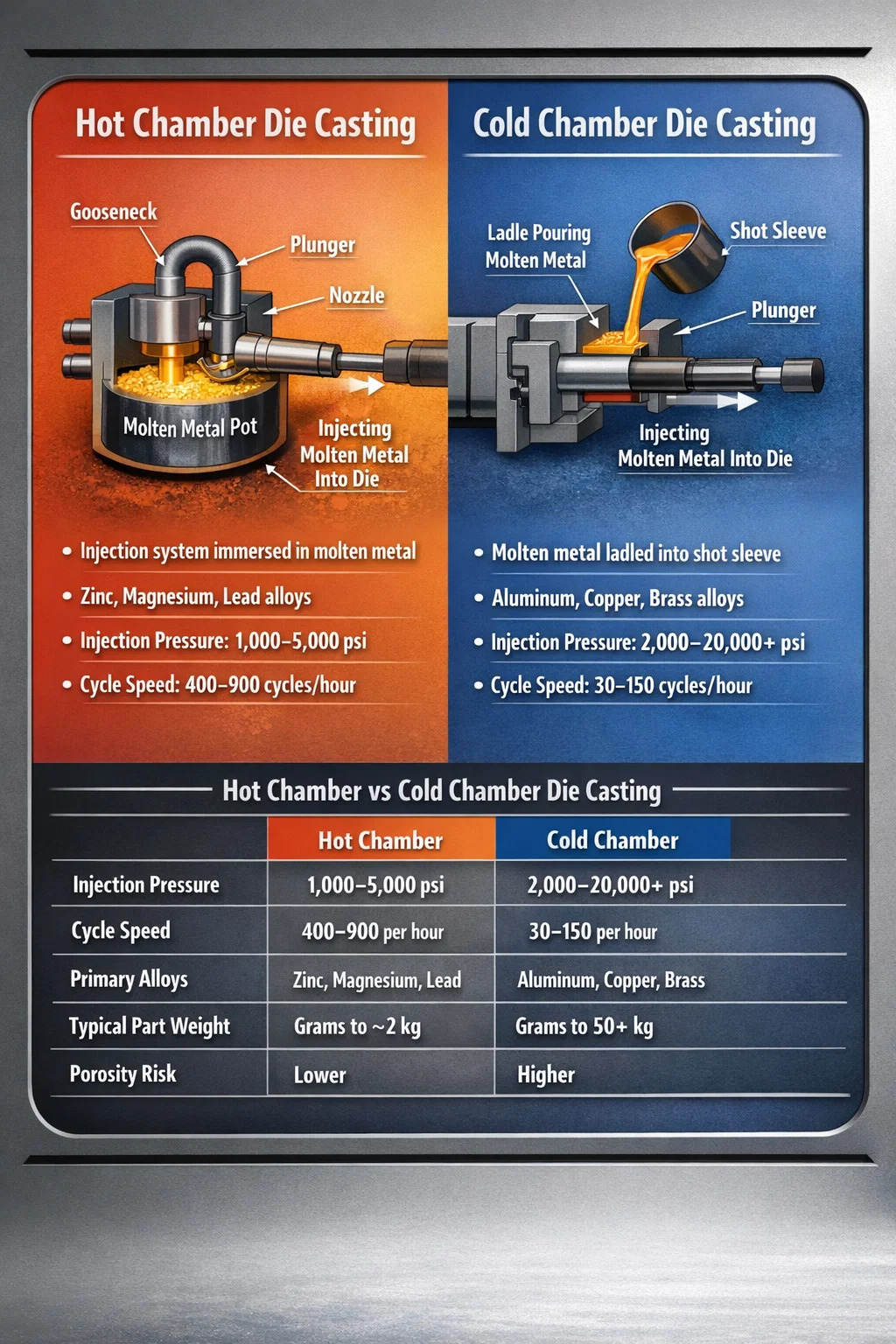 W gorącej komorze odlewanie ciśnieniowe mechanizm wtryskowy zanurzany jest bezpośrednio w kąpieli roztopionego metalu. Maszyna automatycznie wciąga metal do cylindra i wtryskuje go do matrycy w ciągłym, szybkim cyklu. Podczas odlewania ciśnieniowego w zimnej komorze metal topi się w oddzielnym piecu, a następnie kadzi — ręcznie lub automatycznie — do tulei śrutowej przed każdym cyklem wtrysku. Każda metoda ma określone stopy, z którymi dobrze sobie radzi, określone zakresy ciśnień, w których działa, oraz określone wielkości produkcji, gdzie ma to sens ekonomiczny.