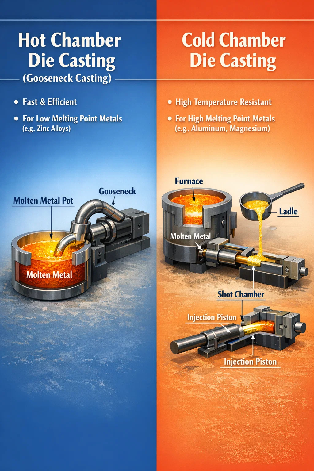 W świecie odlewanie ciśnieniowe istnieją dwie główne kategorie w zależności od sposobu topienia i wtryskiwania metalu do formy: odlewanie ciśnieniowe w gorącej komorze i odlewanie ciśnieniowe w zimnej komorze.