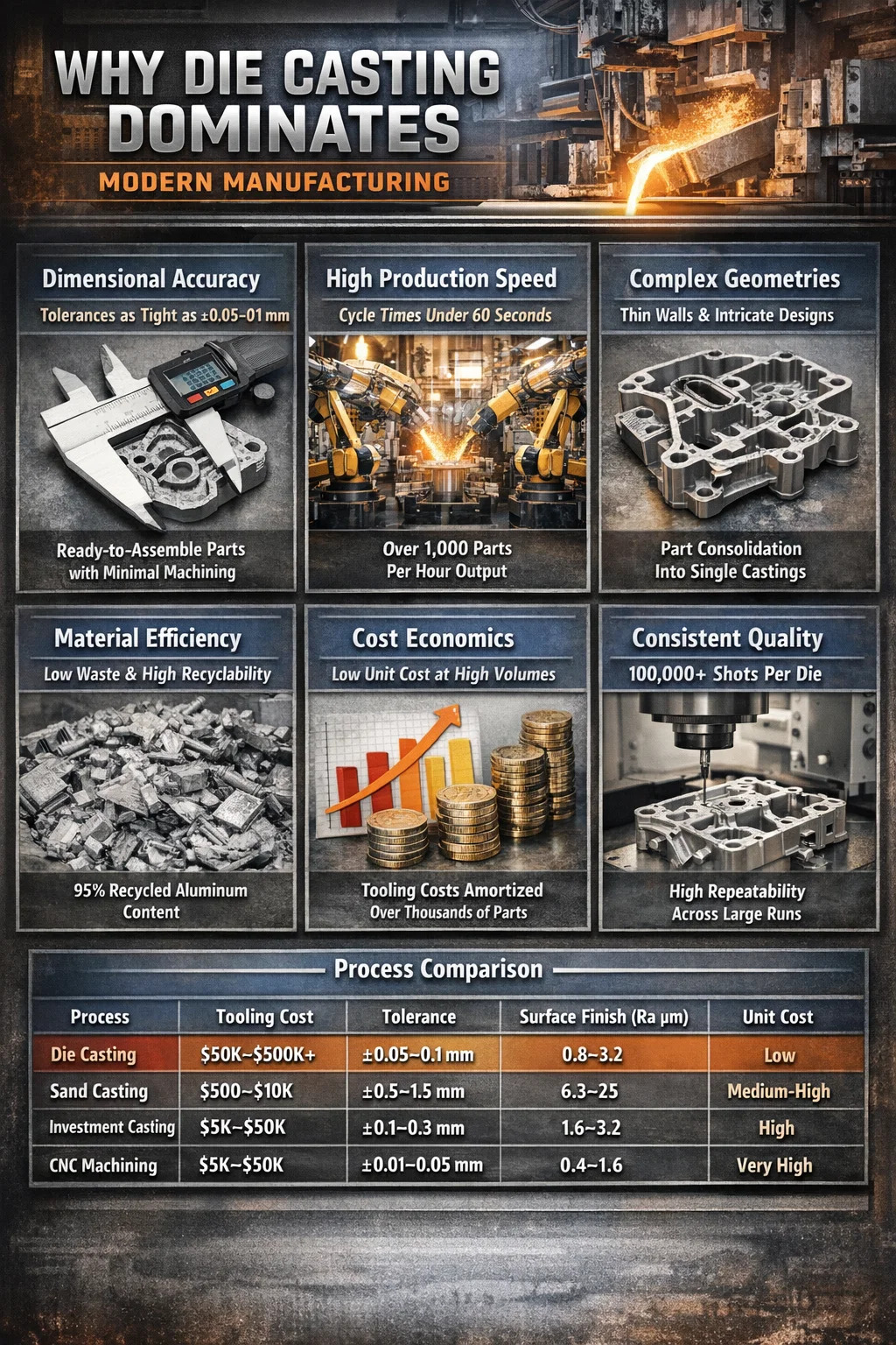 W tym artykule dokładnie wyjaśniono, dlaczego odlewanie ciśnieniowe zajmuje dominującą pozycję w nowoczesnej produkcji, uwzględniając dokładność wymiarową, szybkość, wydajność materiałową, ekonomikę kosztów i porównanie z konkurencyjnymi procesami.
