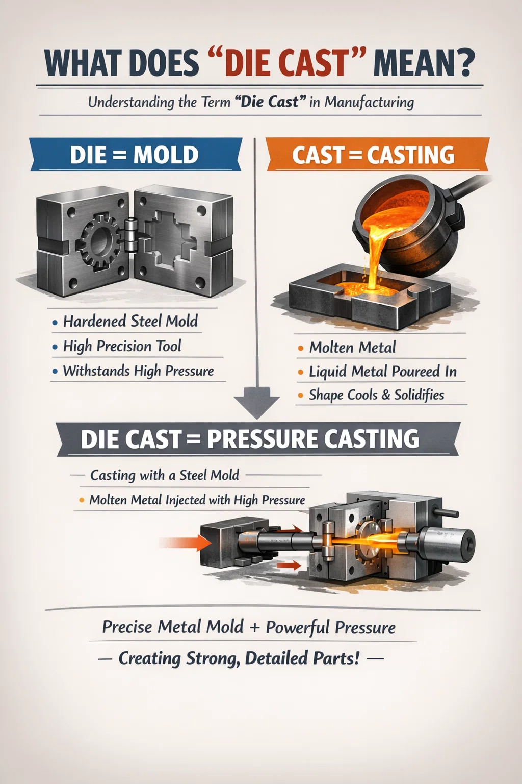 Łącząc te dwa słowa w „odlew ciśnieniowy”, podstawowe znaczenie to: odlewanie ciśnieniowe przy użyciu metalowej formy.