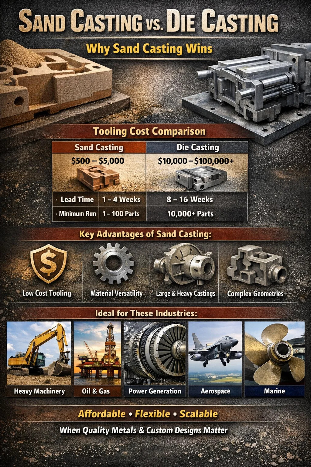 Odlewanie piasku nie jest ograniczone prawie niczym pod względem rozmiaru i wagi. Bloki silników, obudowy turbin, obudowy pomp, śmigła statków i korpusy zaworów przemysłowych są regularnie odlewane w piasku. Ważenie części kilka ton nie są rzadkością w sektorach takich jak wytwarzanie energii, górnictwo oraz wydobycie ropy i gazu na morzu. Pojedynczy element z żeliwa piaskowego dużego silnika wysokoprężnego może ważyć 500 funtów lub więcej – co całkowicie wykracza poza zakres jakiegokolwiek procesu odlewania ciśnieniowego.